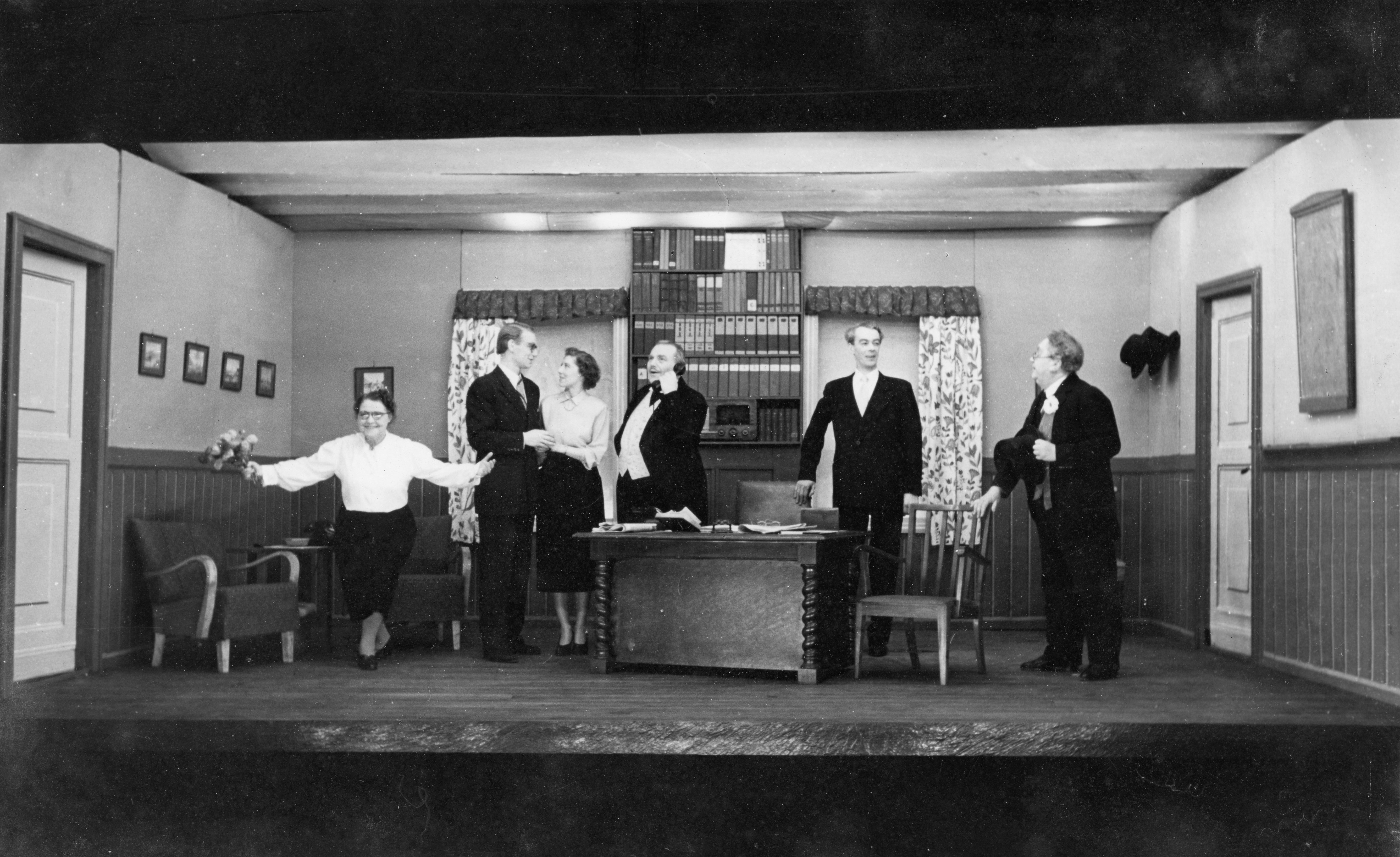 Fotografi fra Komediateatrets produksjon Kranselag i Dokkeby, 1954.