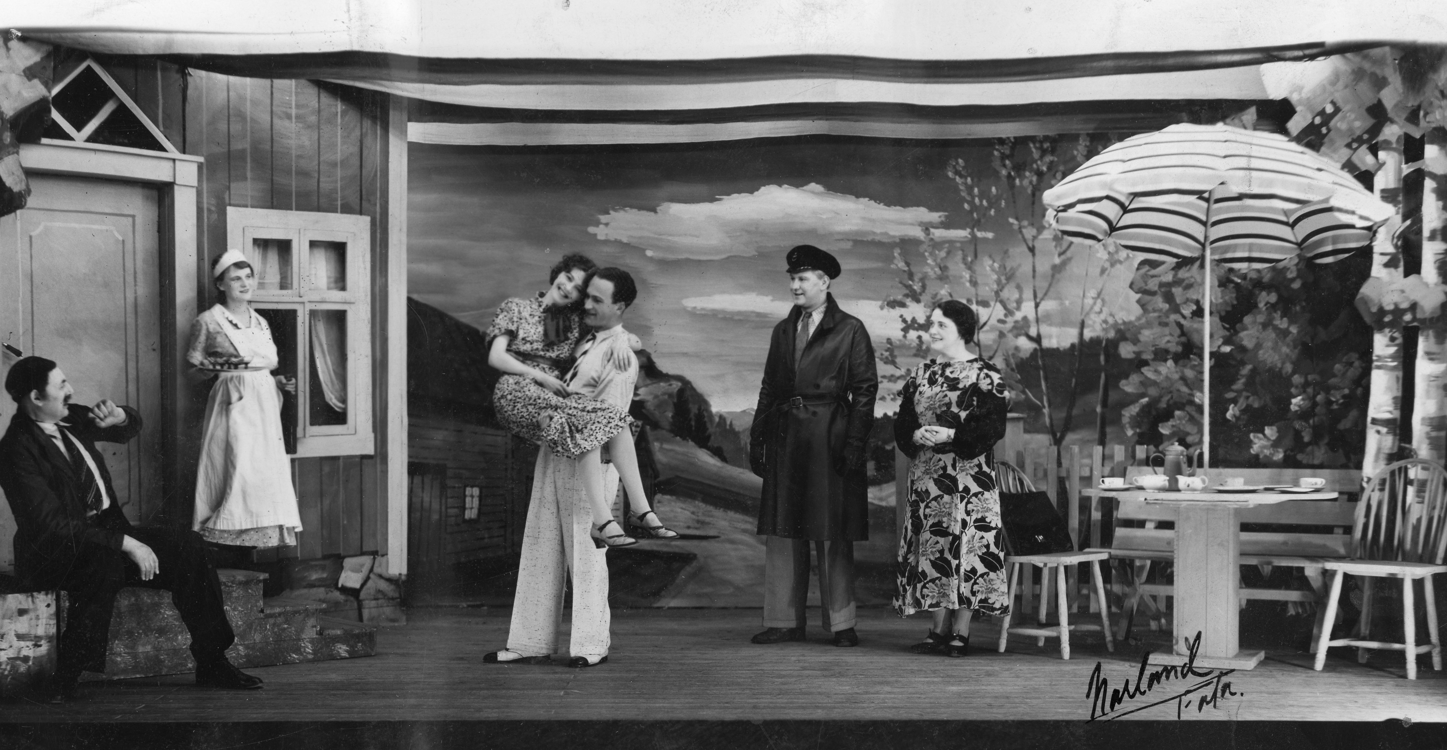 Fotografi fra Komediateatrets produksjon Lykken står den kjekke bi, 1937.