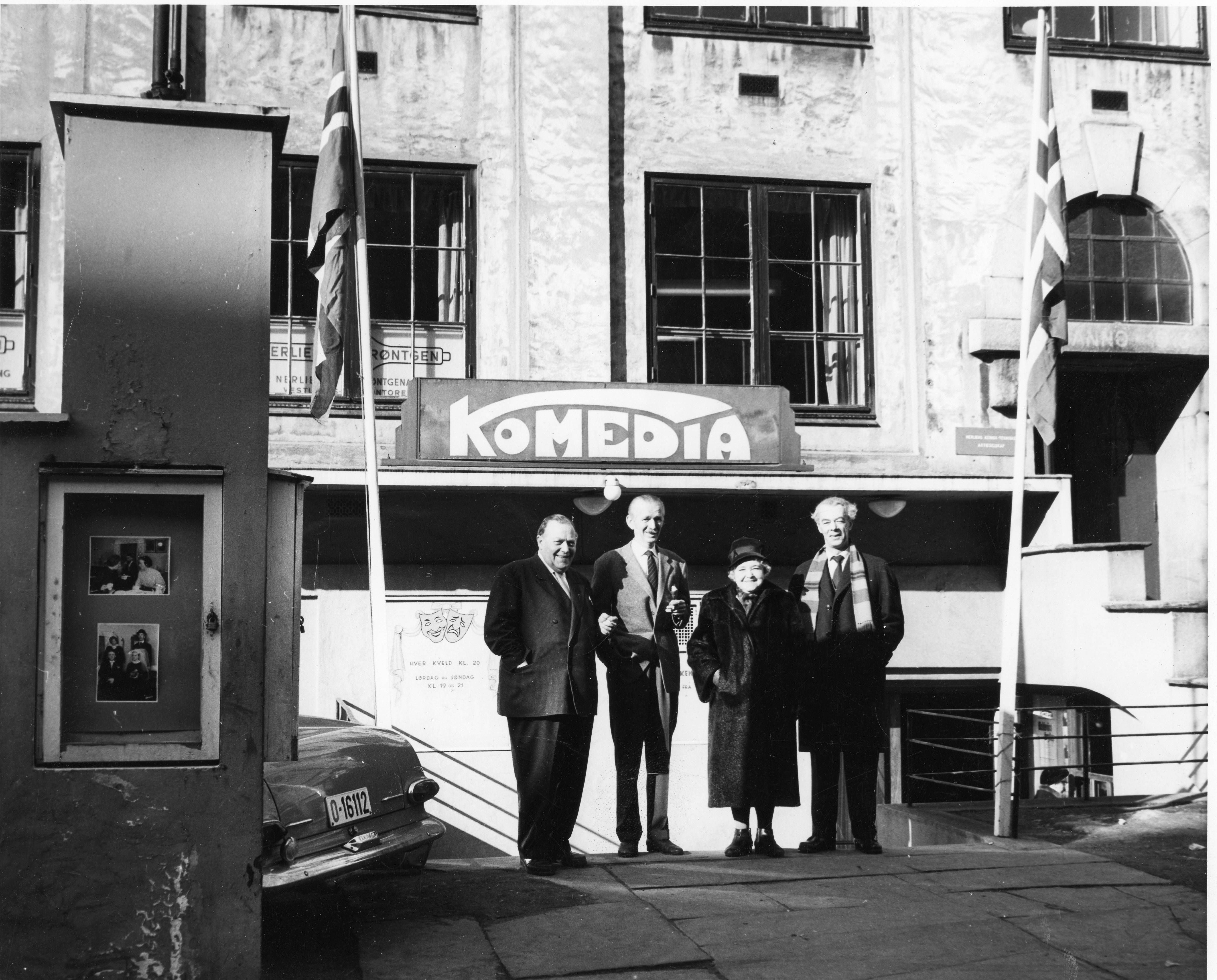Fotografi av Alv Hordnes, Claus Lavik, Gudrun Møklebust og Lars Gåsdal utenfor Komediateatret i Vestre Torvgate, Bergen.