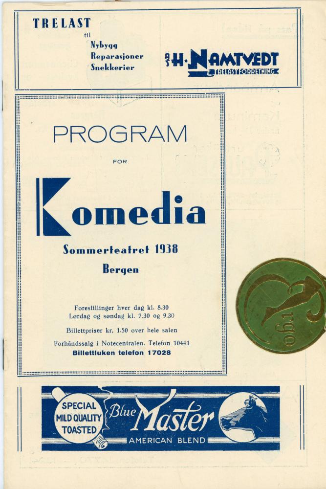 Program fra Komediateatrets produksjon Sumarliv på Næpeplassen, 1938.