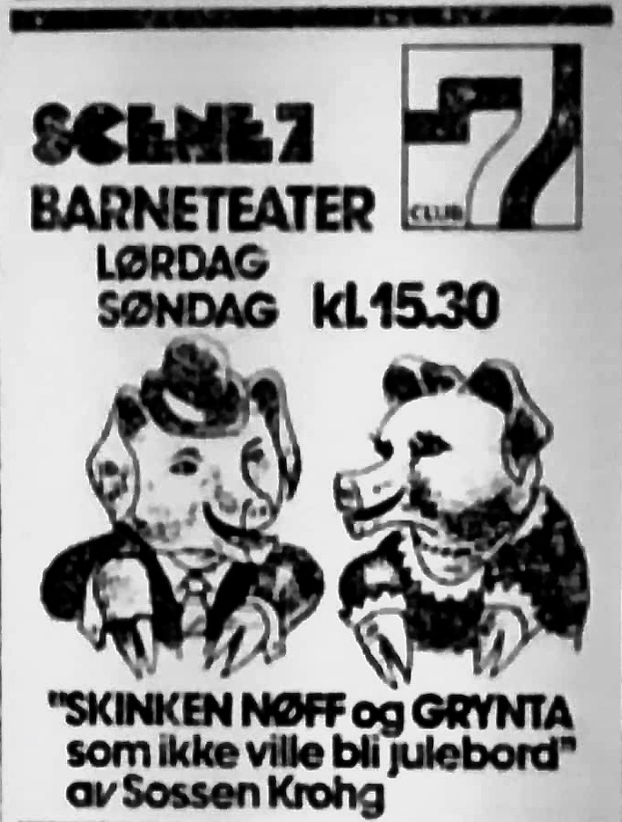 Plakat fra Scene 7s produksjon Skinken Nøff og Grynta som ikke ville bli julebord (1974)