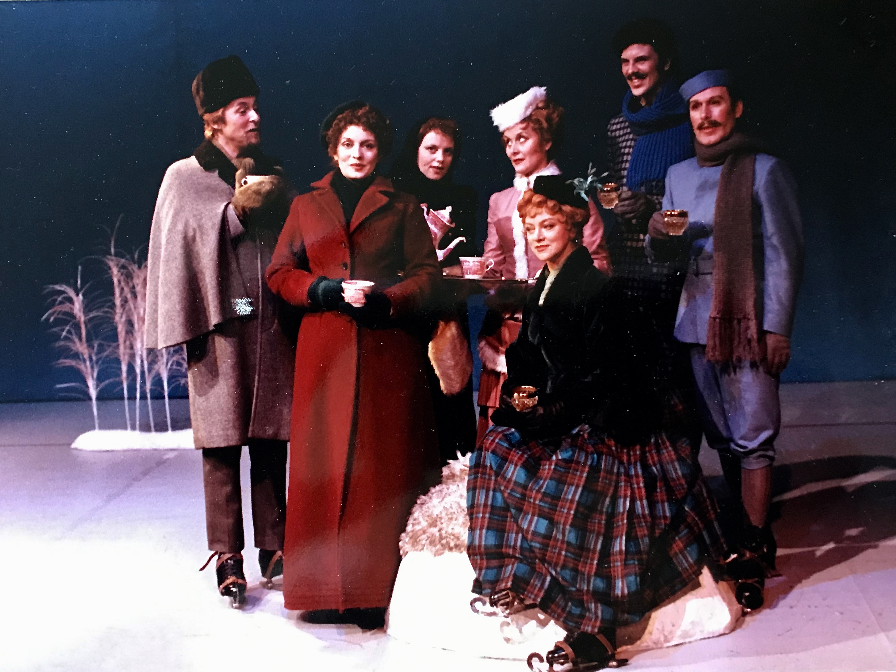 På bildet: Ensemblet i kostymer fra 2. akt, den berømte "skøyteakten", Svein Haagensen, Anne Beate Odland, Berit Kullander, Marit Bolling, Jarl Goli, Noralv Teigen - og Vibeke Kleppe som "Sandbergs pike".