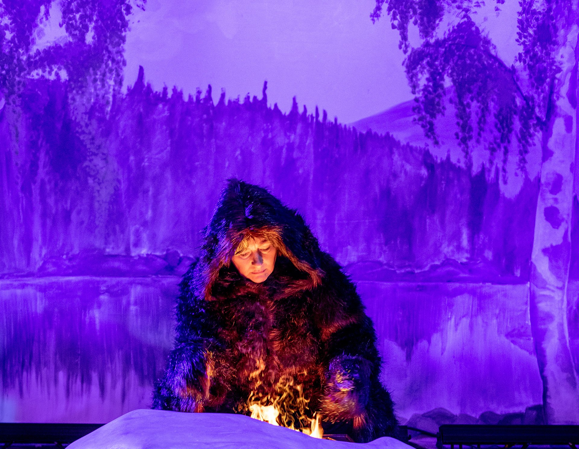 Forestillingsfoto fra Den Nationale Scene og Teater Innlandets produksjon Bjørnejegerskens bekjennelser (2021).
