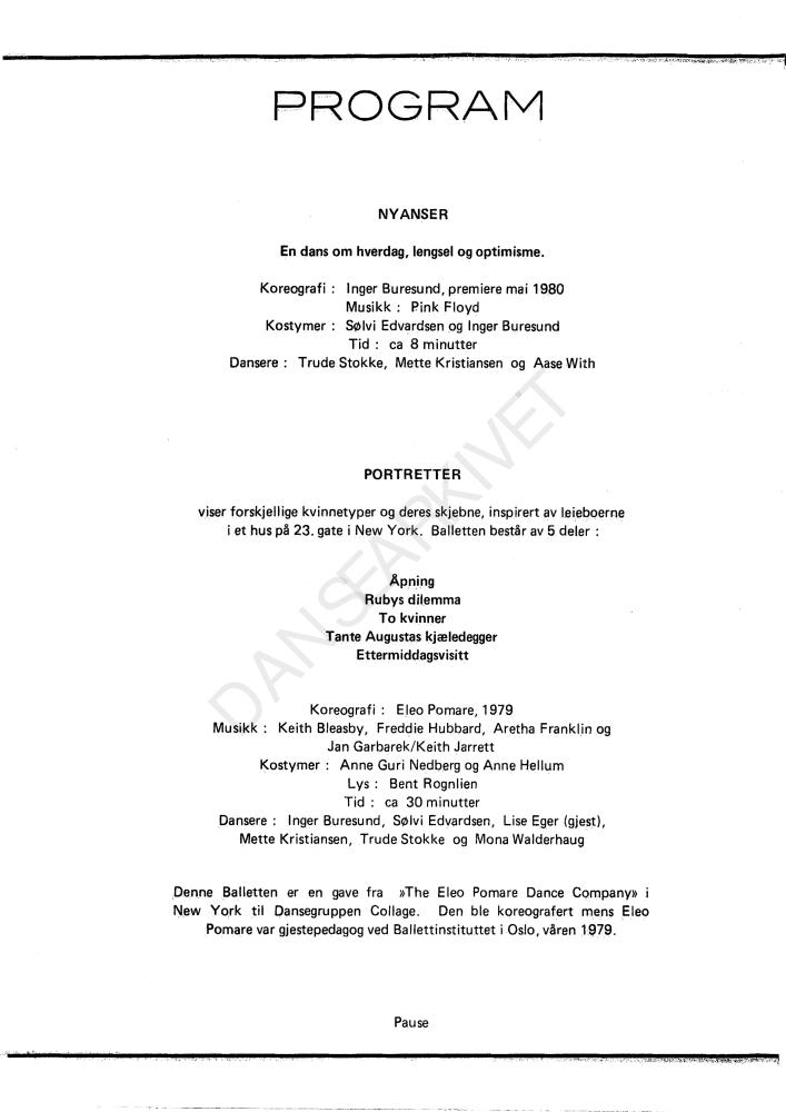 Program for Collage Dansekompanis produksjoner "NYANSER" (1980) og "PORTRETTER" (1979)