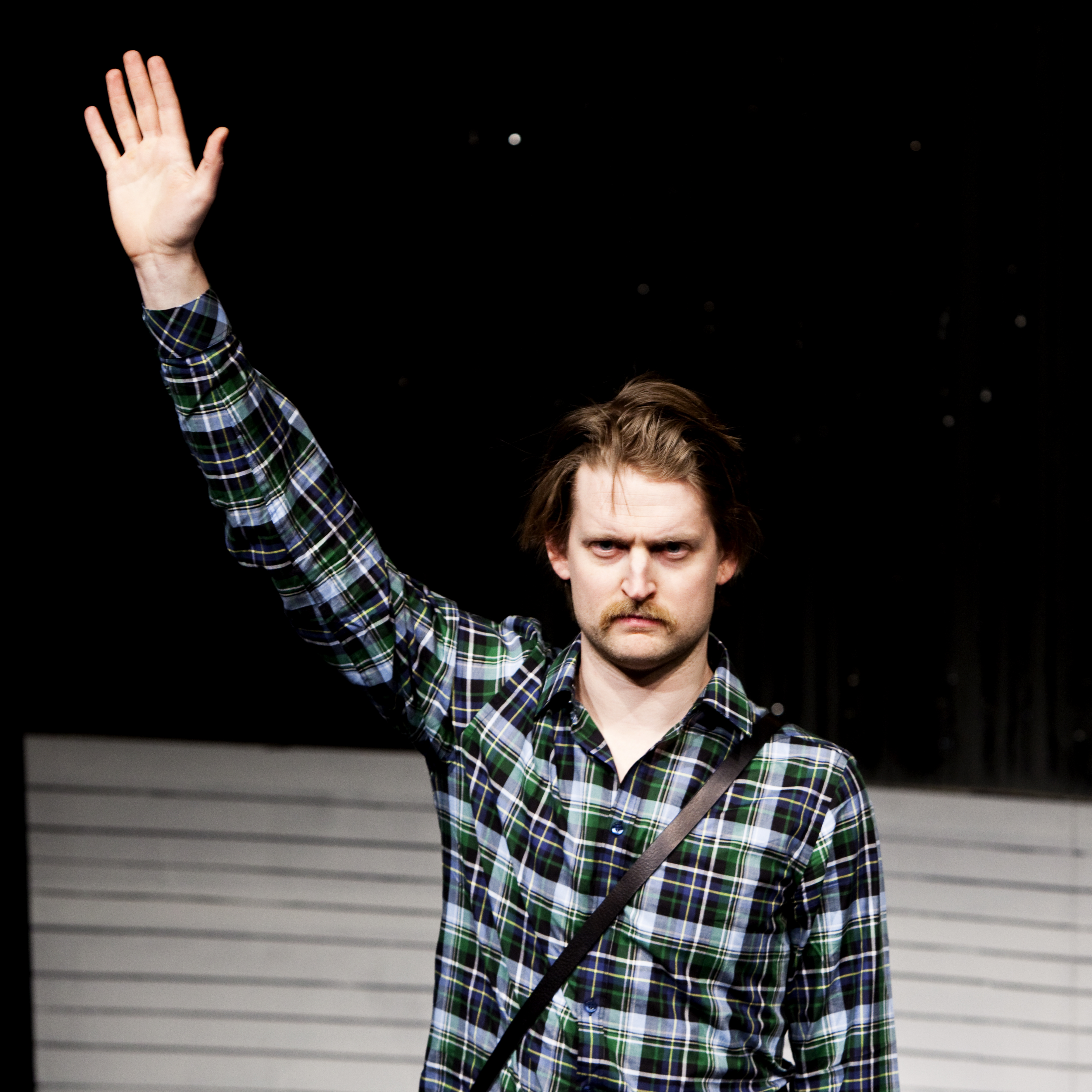 Fotografi fra Isenkramteaterets produksjon Ikaros faller/learning to fly (2010). På bildet: Nils Petter Mørland. Fotograf: Ukjent.