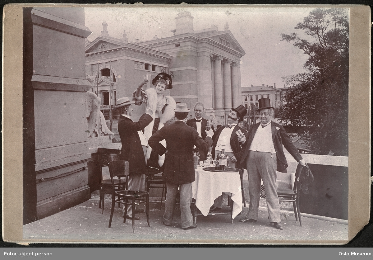 Skuespiller på Christiania Tivolis balkong, mot Nationaltheatret.
