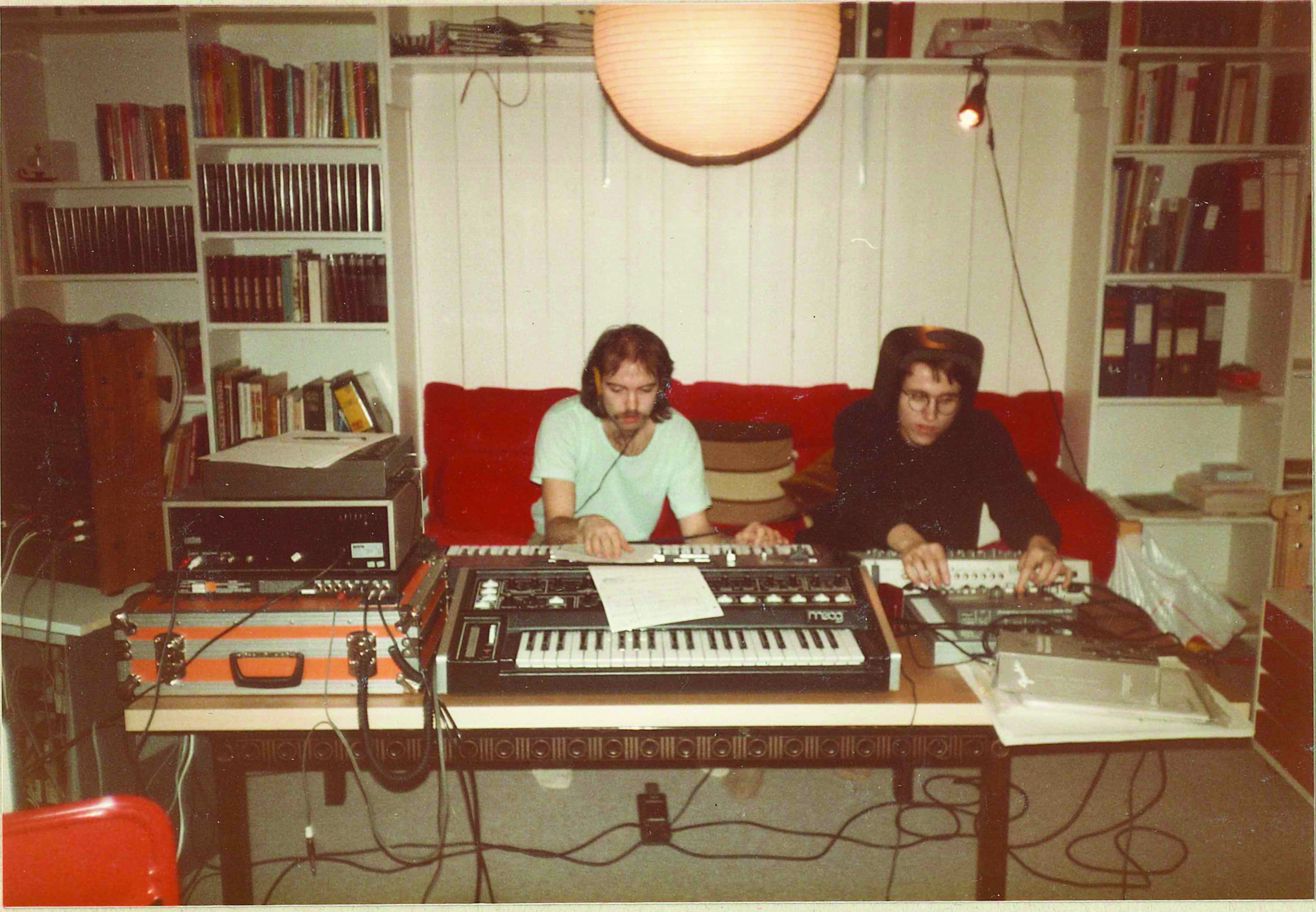 «Instrumentene vi jobber med akkurat her er Moog multimoog synthesizer, Roland JX-3P synthesizer, Roland MSQ-100 sequencer, Roland TR-909 trommemaskin, pluss noen miksere og forsterkere. Dagfinn har på de berømte Float hodetelefonene.»