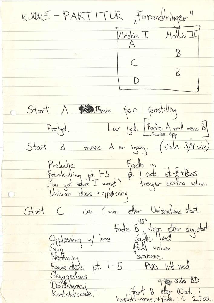 Kjørepartitur av Dagfinn Koch og Terje Winther fra Andanse-kompaniets produksjon "Forandring" (1985)