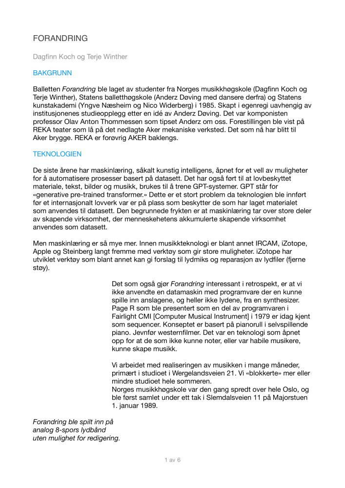 Artikkel av Terje Winther og Dagfinn Koch om arbeidet med musikkverket Forandring (1985) som ble skrevet til balletten Forandring (1985). Balletten var en danseproduksjon av studenter ved Norges musikkhøgskole, Statens balletthøgskole og Statens kunstakademi, etter en idé av Anderz Døving.