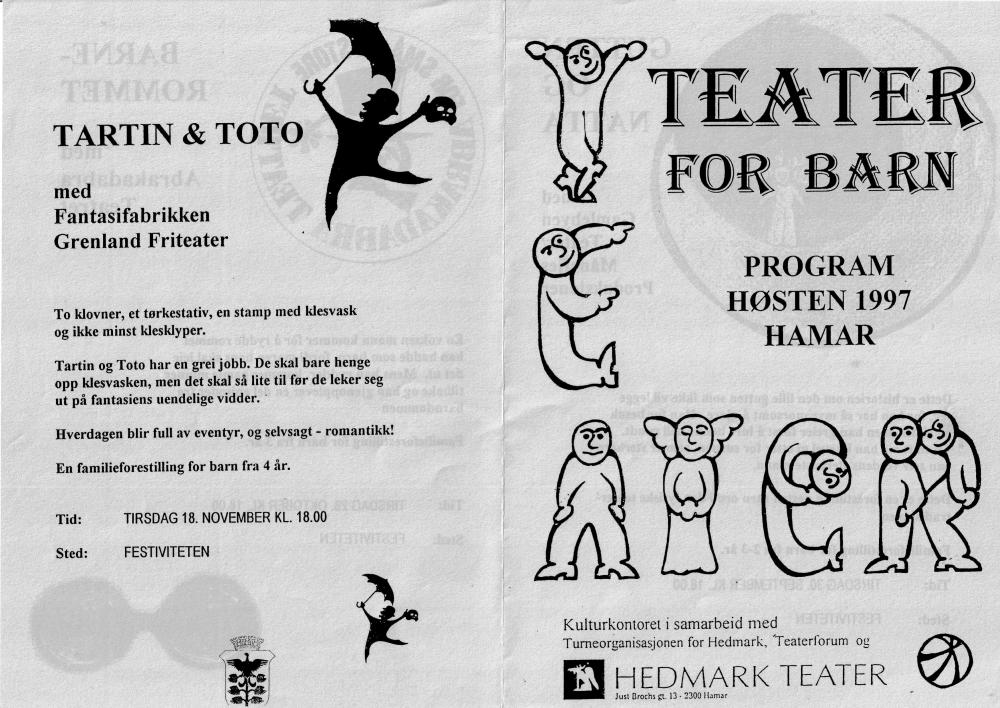 Program av Kulturkontoret, Turneorganisasjonen i Hedmark, Teaterforum og Hedmark Teaters høstprogram fra 1997. Her med Fantasifabrikken og Grenlandland Friteaters produksjon Tartin & Toto (1995).