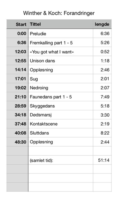 Bilde av sporliste til musikkverket Forandring (1985) fra Andanse-kompaniets produksjon Forandring (1985).