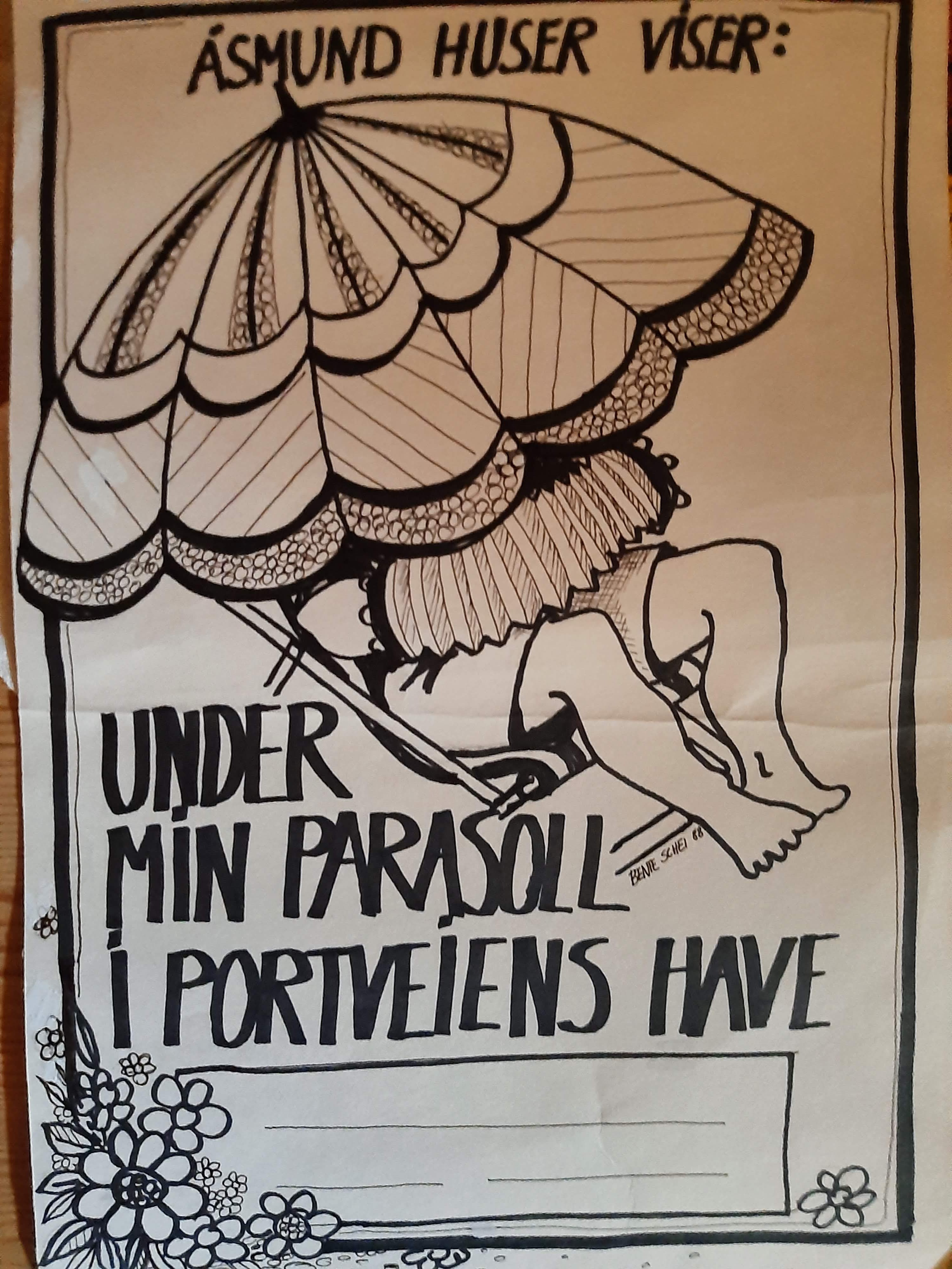 Plakat fra Under min parasoll i Portveiens hage (1988) av Unge Husers Dukketeater.