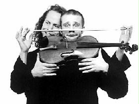 Foto fra Jo Strømgren Kompanis produksjon Maskuline mysterier(1997). På bildet: Bergmund Waal Skaslien, Jo Strømgren. Foto: Thor Brødreskift.