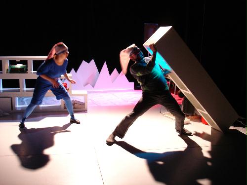 Fotografi fra Transiteatret-Bergens produksjon Trio for to skuespillere og spansk gitar (2004). På bildet: Sara Norlin, Tor Christian Faugstad Bleikli.