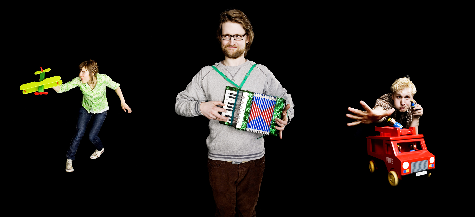 Fotografi fra Isenkramteaterets produksjon Lekene slår tilbake! (2008). På bildet: Ingvild Haugstad, Nils Petter Mørland, Mats Eldøen. Fotograf: Ukjent.