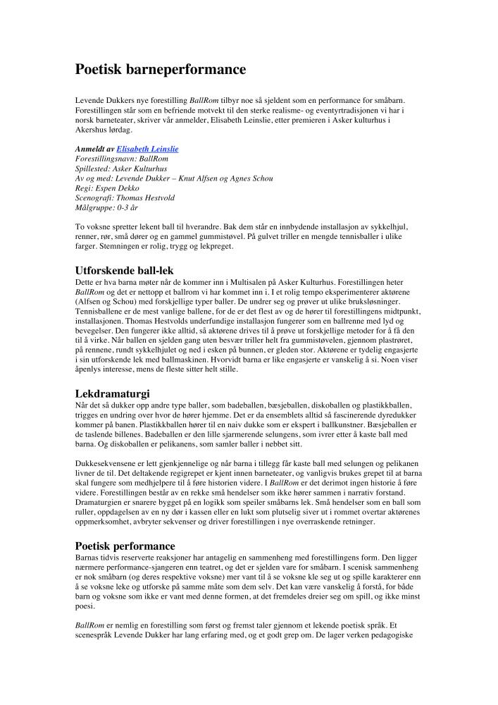 Poetisk barneperformance. En anmeldelse av Levende Dukkers produksjon BallRom (2007). Anmeldelsen ble publisert på Scenekunst.no 7. mai 2007.