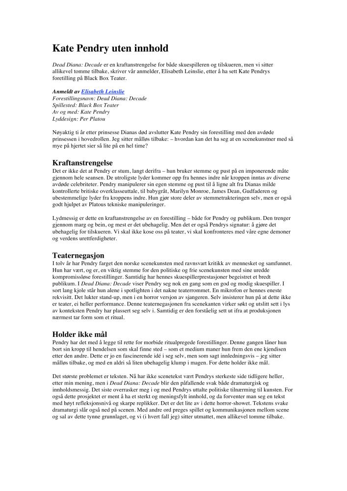 Anmeldelse av Elisabeth Leinslie på Scenekunst.no av Kate Pendrys produksjon Dead Diana: Decade (2007).