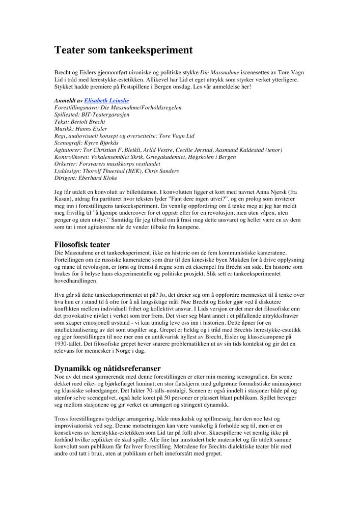 Teater som tankeeksperiment. En anmeldelse av Transiteatret-Bergens produksjon Die Massnahme/Forholdsregelen (2007). Anmeldelsen ble publisert på Scenekunst.no 1. juni 2007.