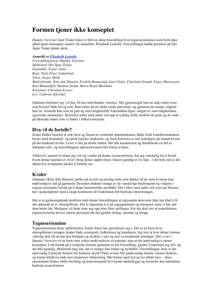 Anmeldelse av Elisabeth Leinslie på Scenekunst.no av Teater Jokers produksjon Hundre værelser (2007).