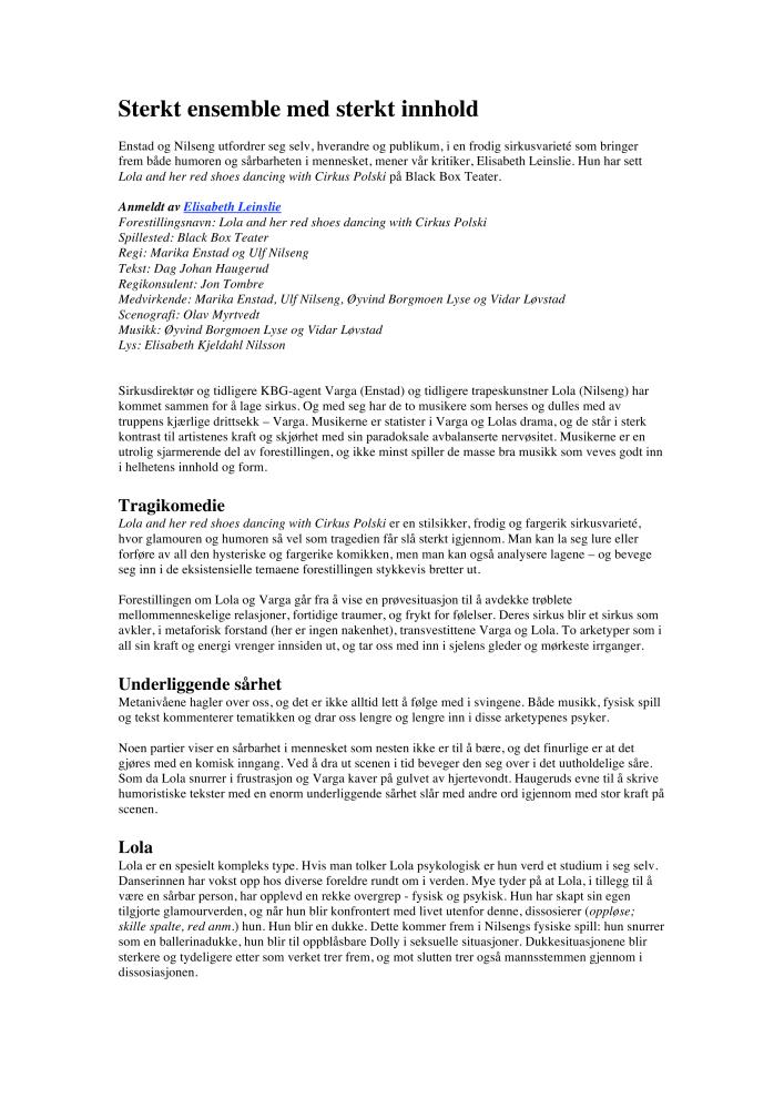 Sterkt ensemble med sterkt innhold. En anmeldelse av Engstad og Nilsengs produksjon Lola and her red shoes dancing with Cirkus Polski (2007). Anmeldelsen ble publisert på Scenekunst.no 1. oktober 2007.
