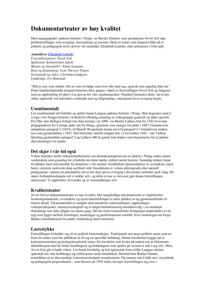 Dokumentarteater av høy kvalitet. Anmeldelse av Barske Glæders produksjon Norsk Nok (2007). Anmeldelsen ble publisert på Scenekunst.no 9. mai 2007. Tekst: Elisabeth Leinslie