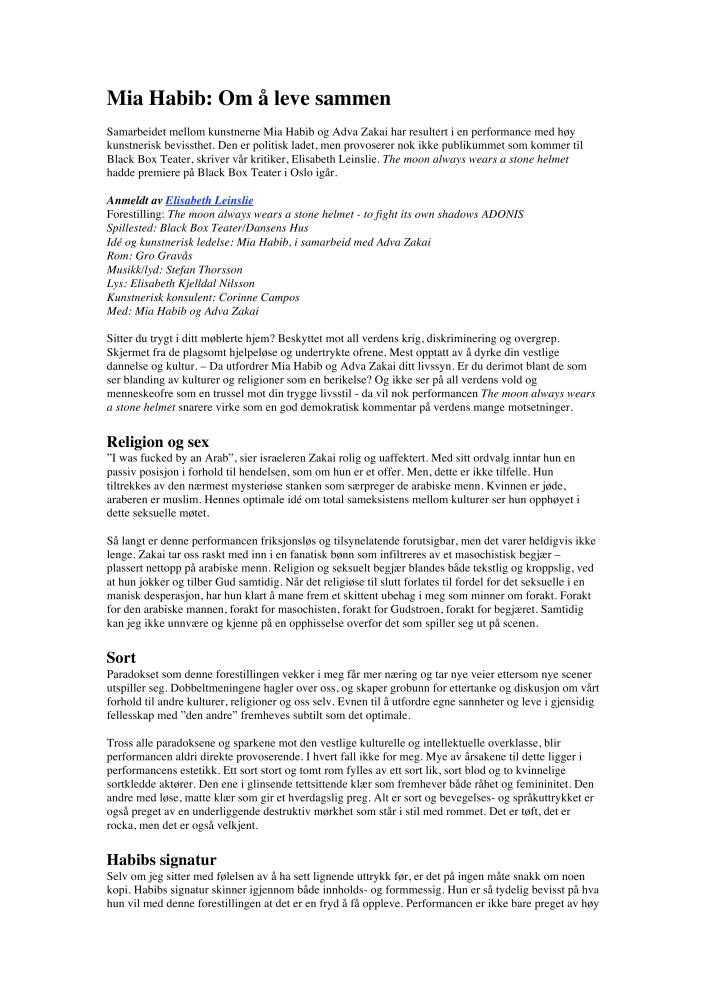 Mia Habib: Om å leve sammen. En anmeldelse av Mia Habibs produksjon The moon always wears a stone helmet - to fight its own shadows ADONIS (2007). Anmeldelsen ble publisert på Scenekunst.no 20. april 2007.