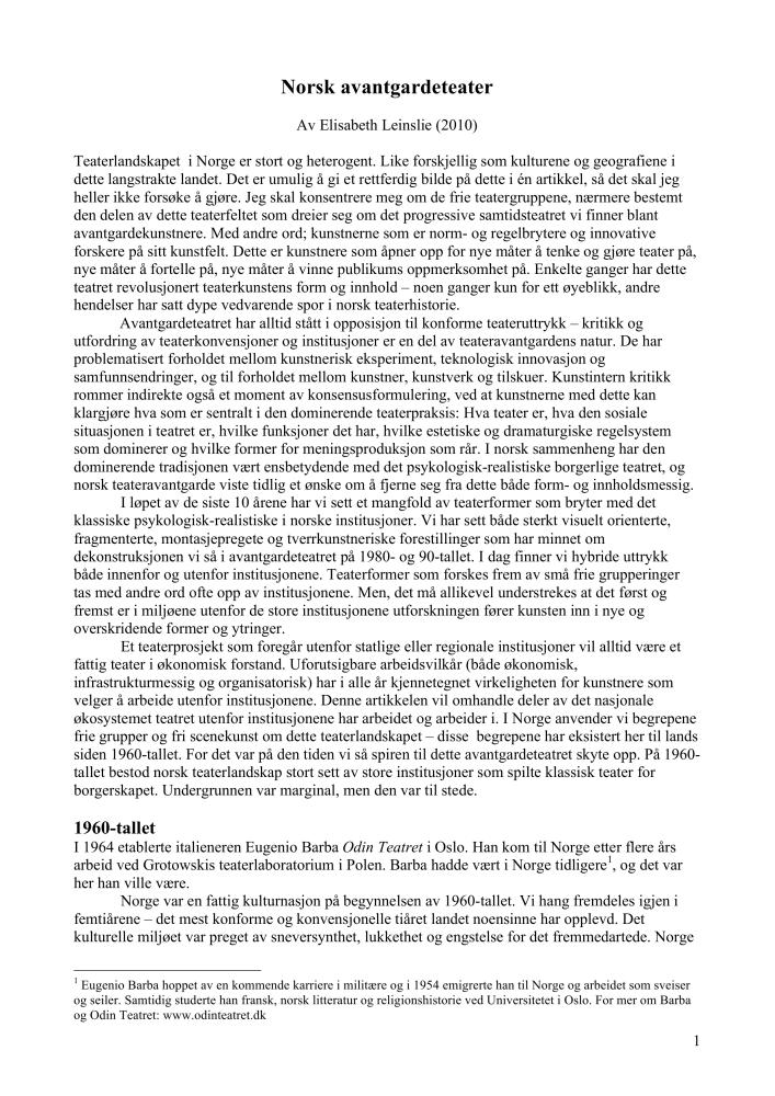 Historisk artikkel av Elisabeth Leinslie om norsk avantgardeteater (2010).