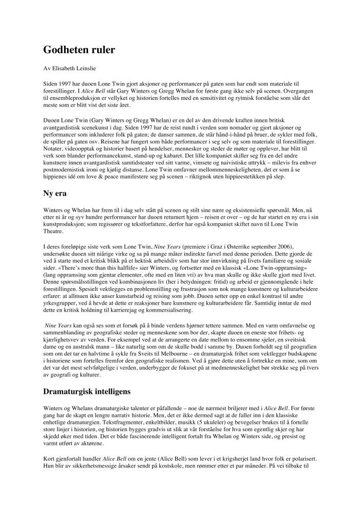 Godheten ruler. Anmeldelse av Lone Twins produksjon Alice Bell (2006). Anmeldelsen ble publisert på Kunstkritikk.no 23. mars 2007.