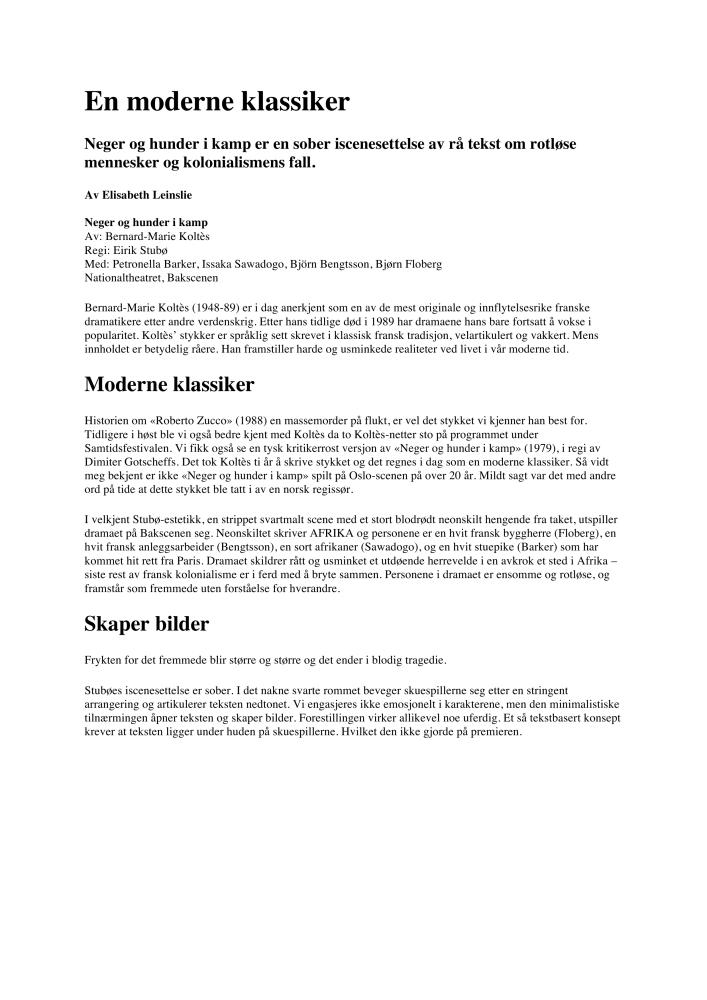 En moderne klassiker. Anmeldelse av Nationaltheatret og Det Norske Teatrets produksjon Neger og hunder i kamp (2007). Anmeldelsen ble publisert i Dagsavisen og på Dagsavisen.no 28. november 2007.