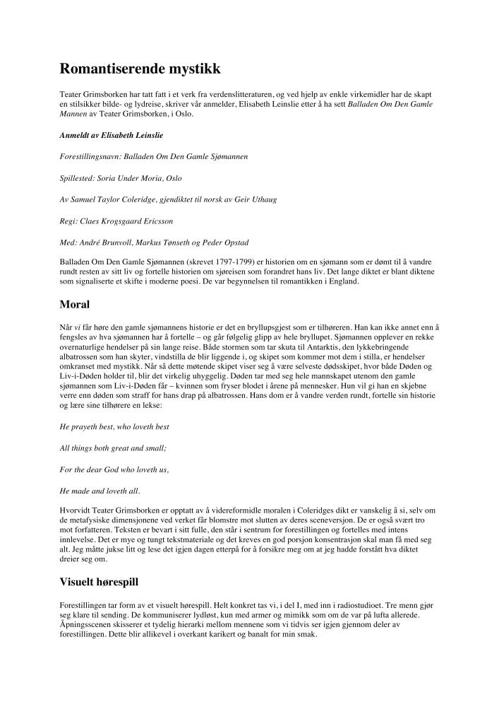 Romantiserende mystikk. En anmeldelse av Teater Grimborkens produksjon Balladen Om Den Gamle Sjømannen (2007). Anmeldelsen ble publisert på Scenekunst.no 20. desember 2007.
