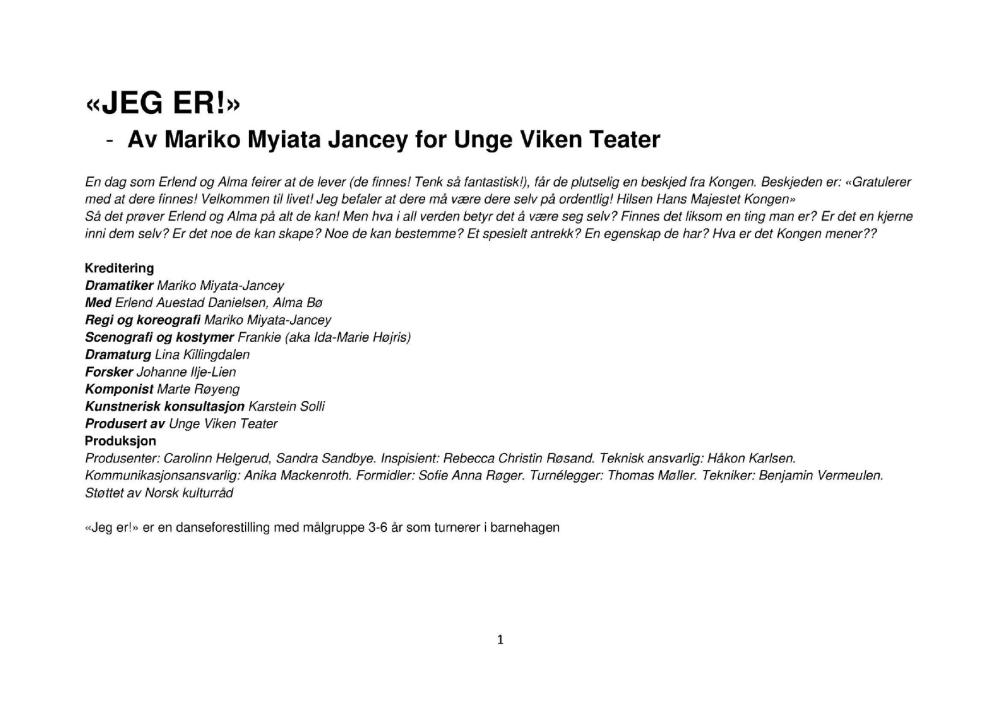 Forestillingsprogram til Unge Vikan Teaters produksjon Jeg er! (2025).
