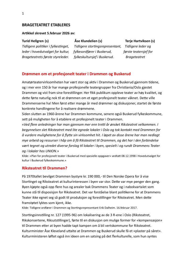 Brageteatret etableres. Artikkel om prosessene bak etableringen av Brageteatret i Drammen. Artikkelene er skrevet i 2026.