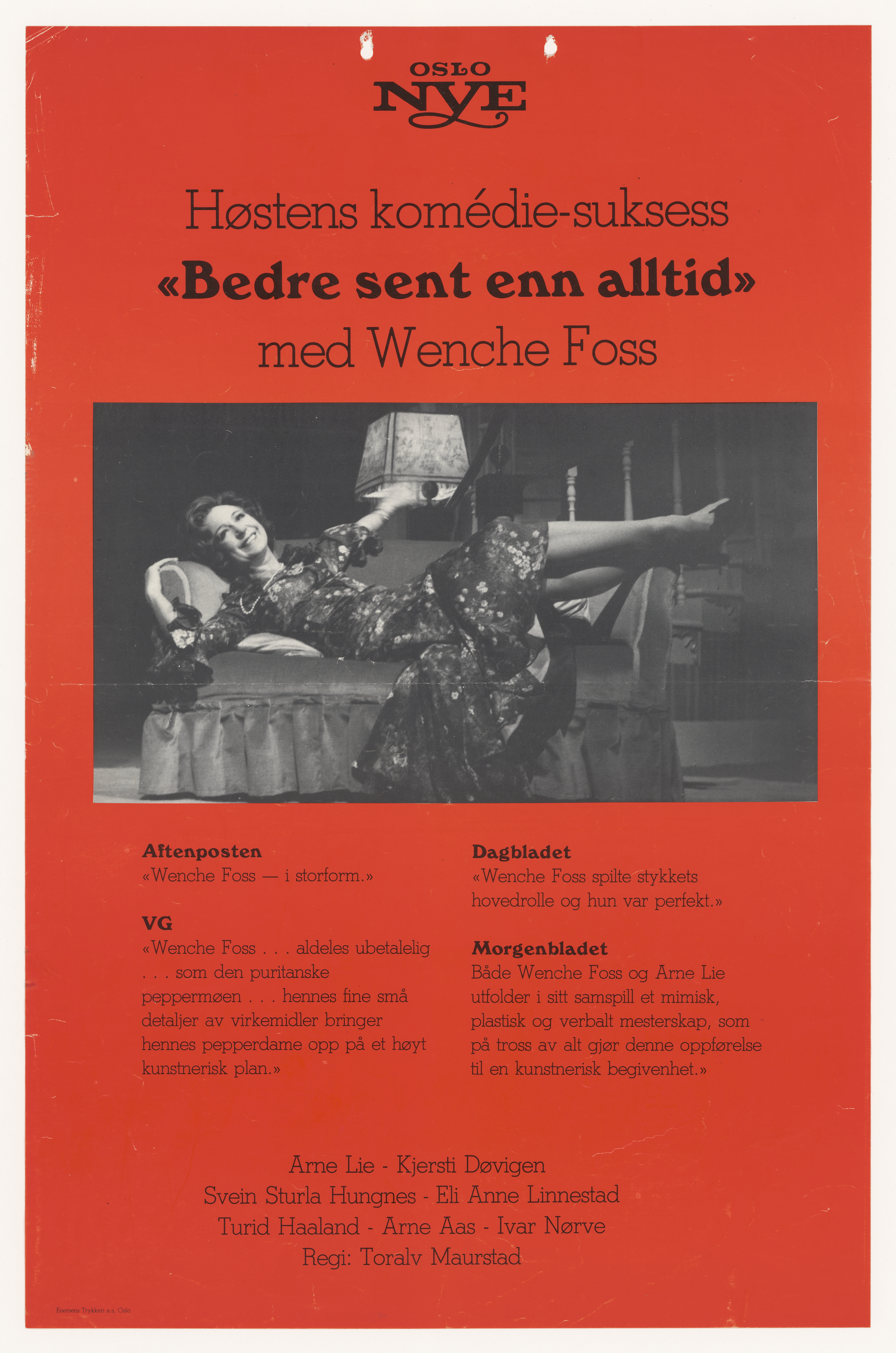 Plakat fra Oslo Nye Teaters produksjon Bedre sent enn alltid (1977).