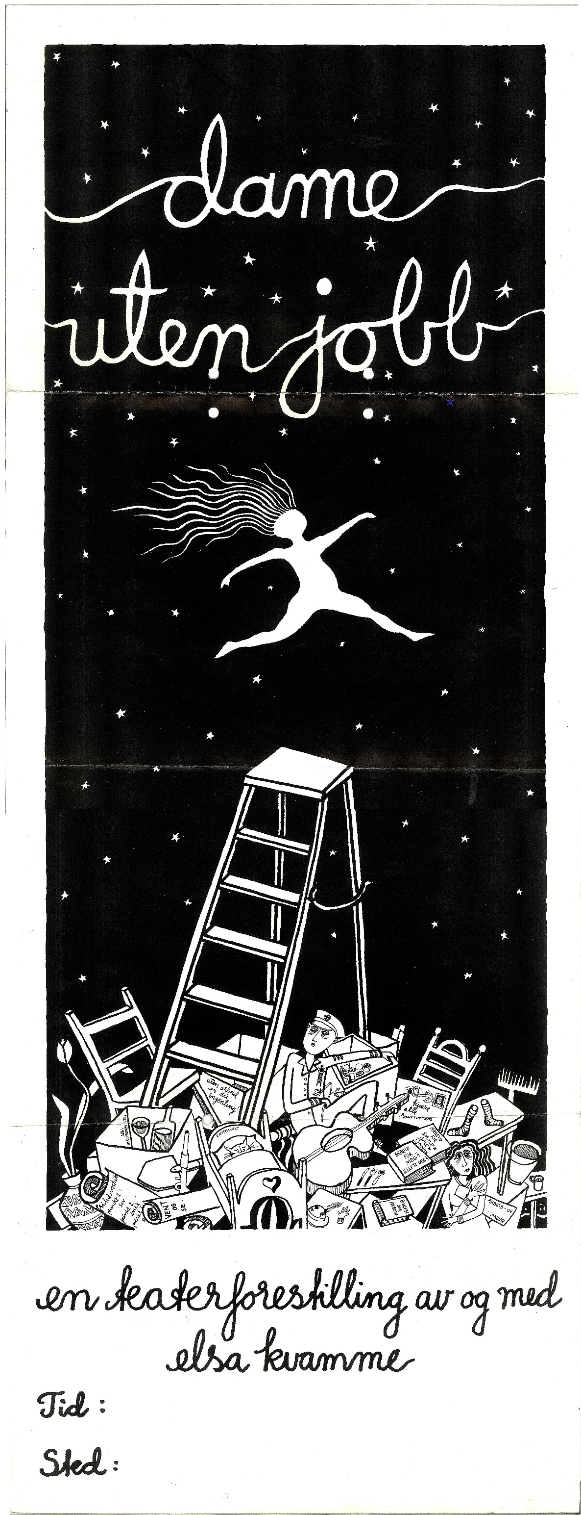 Plakat til teaterforestillingen Dame uten jobb (1984) av og med Elsa Kvamme.