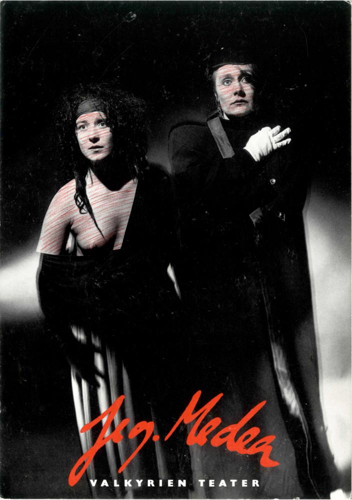 Flygeblad til Valkyrien Teaters produksjon Jeg. Medea (1989). På bildet: Siv Jarto og Elsa Kvamme.