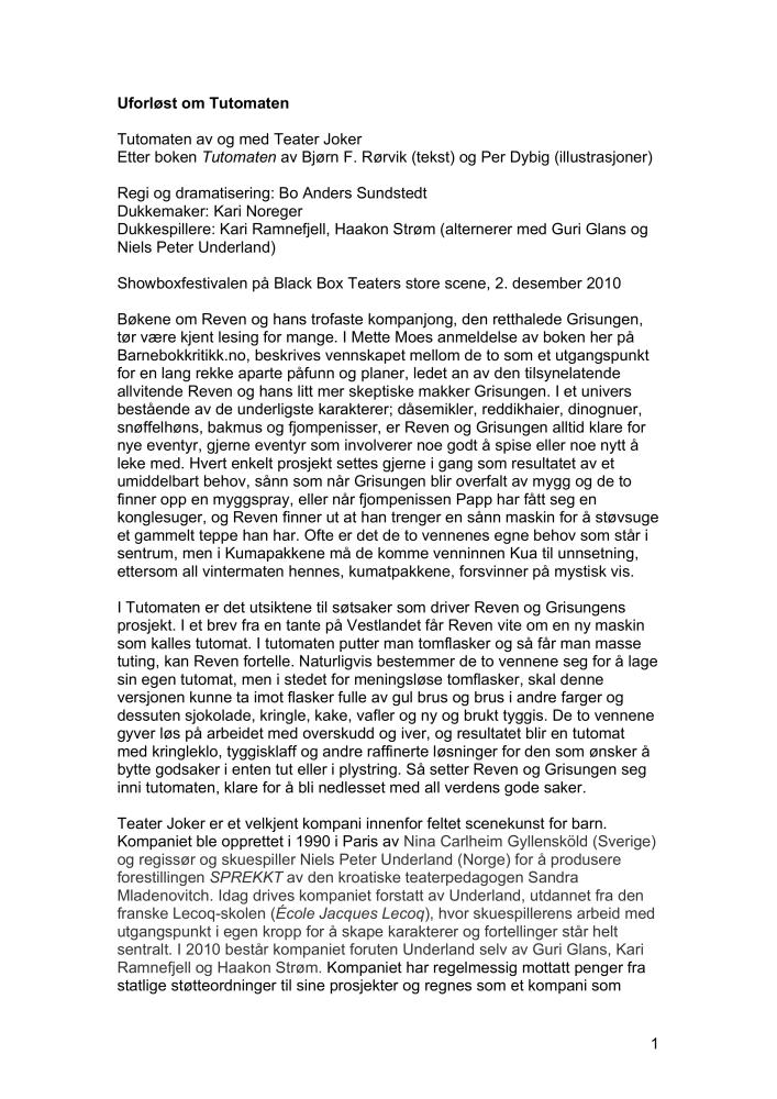 Uforløst om Tutomaten. Anmeldelse av Teater Jokers forestilling Tutomaten fra 2010. Skrevet av Lisa Marie Nagel og publisert på barnebokkritikk.no. i desember 2010.