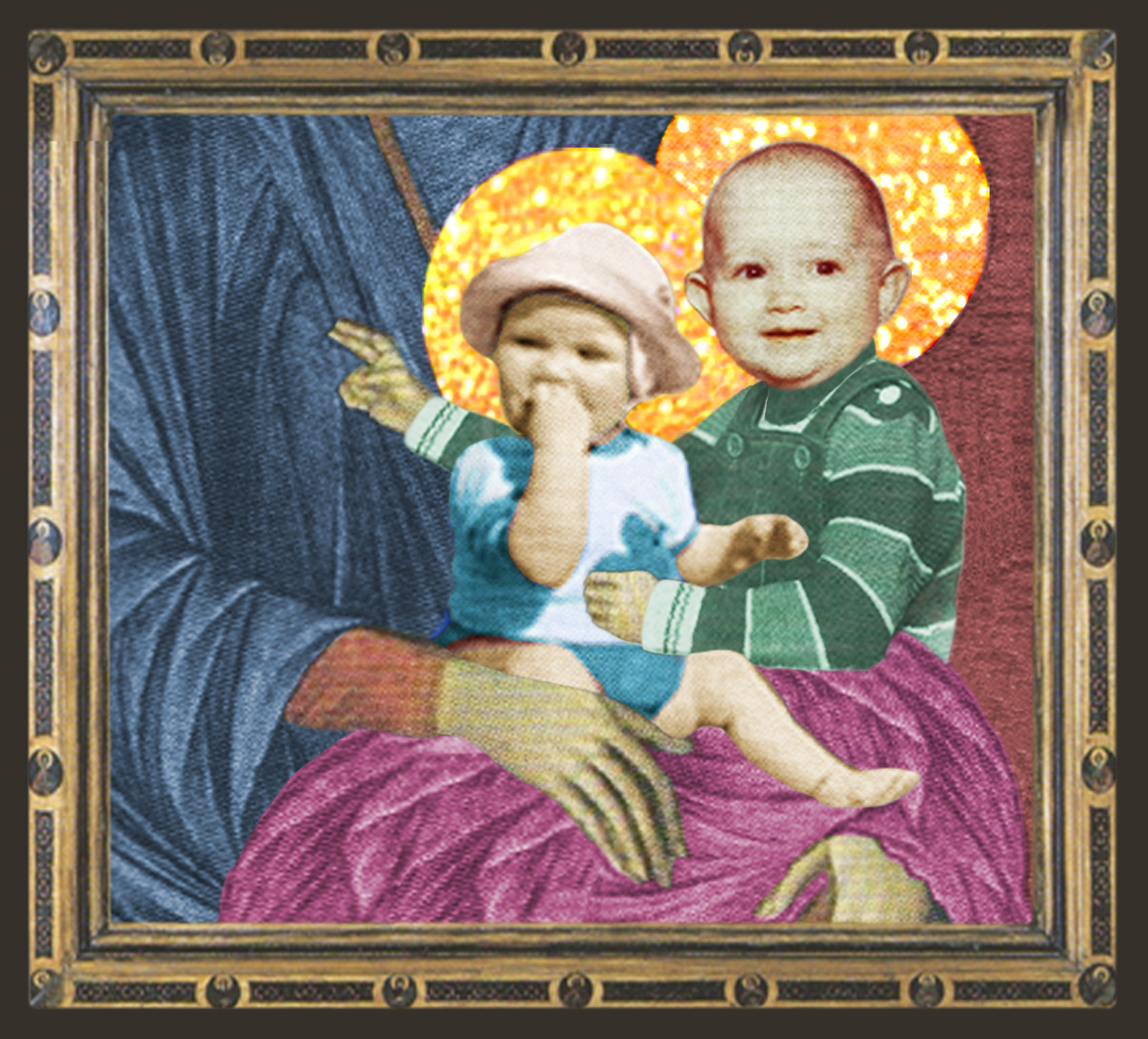 "Grith og Susanne". Illustrasjonscollage fra produksjonen turning into saints (2011) av Grith Ea Jensen og Susanne Irene Fjørtoft. Barnebilder av (f.v) Susanne Irene Fjørtoft og Grith Ea Jensen, manipulert inn i et religiøst motiv.