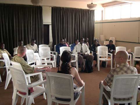 Fotografi fra Baktruppens arbeide med produksjonen Do & Undo (2002). Fra pressekonferansen knyttet til forestillingen på The National Theatre i Kampala, Uganda. Fotograf: ukjent