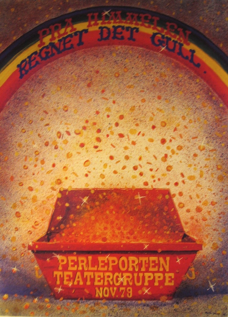 Plakat til Perleporten Teatergruppes produksjon Fra himmelen regnet det gull (1979).