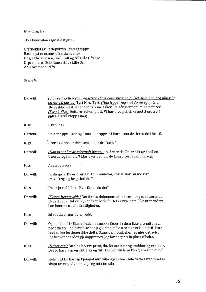 Manusutdrag fra Perleporten Teatergruppes produksjon "Fra himmelen regnet det gull" (1979)