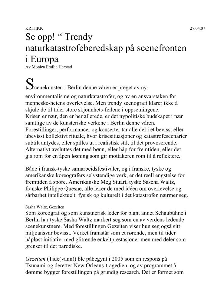 Se opp! Trendy naturkatastrofeberedskap på scenefronten i Europa. Artikkel av Monica Emilie Herstad. Artikkelen ble publisert på Kunstkritikk 27. april 2007.
