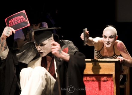 Rude Behaviour. Fotografi fra Pains Solutions produksjon FakirSkolens Eksamen (2007). På bildet: Håvve Fjell (The HeadMaster), Marte Maritdatter (The Princess of Scars). Fotograf: Helene Fjell
