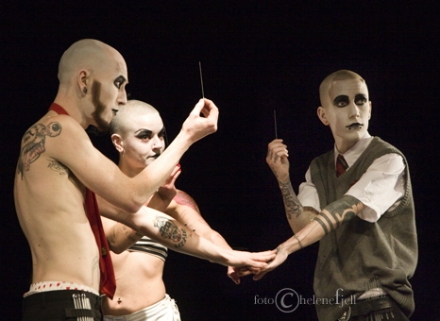 Triple Pincushion. Fotografi fra Pains Solutions produksjon FakirSkolens Eksamen (2007). På bildet: ukjent (The Maniac), Marte Maritdatter (The Princess of Scars), ukjent (The Bad Boy). Fotograf: Helene Fjell
