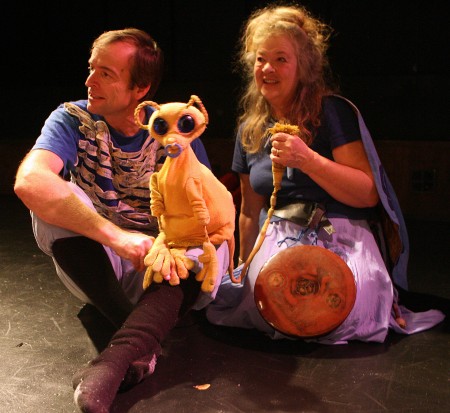 Fotografi fra Levende Dukkers produksjon Baobab og Bushbaby (2001). På bildet: Knut Alfsen, Bushbaby, Agnes Schou. Fotograf: Ukjent.