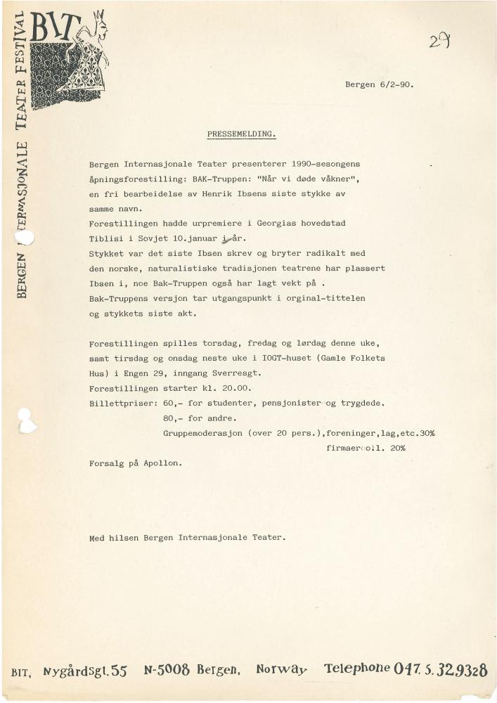 Pressemelding for Baktruppens produksjon Når vi døde våkner (1990). Pressemeldingen ble produsert og sendt ut av Bergen Internasjonale Teater.