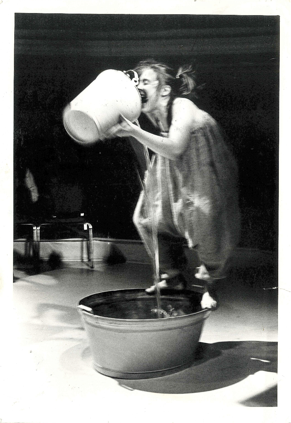 Fotografi fra soloforestillingen Mannen som fødte en kvinne (1981) av og med Elsa Kvamme. På bildet: Elsa Kvamme (som Sekkebarnet). Foto: Agnethe Weisser