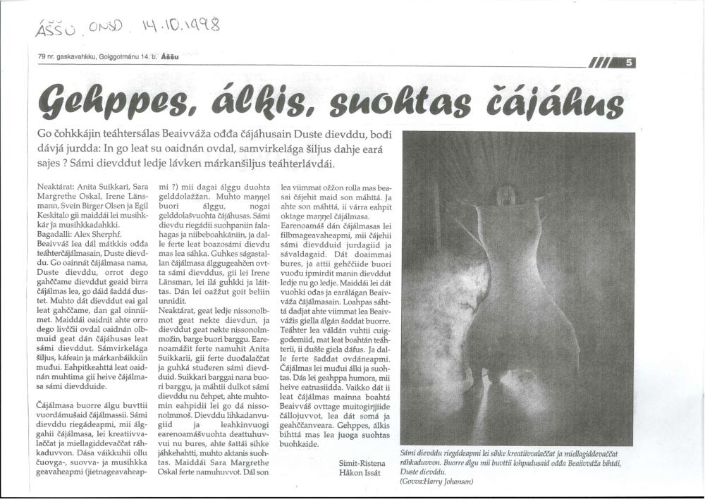 Anmeldelse i Assu av Beaivváš Sámi Našunálateáhter og Sampo Teaters produksjon "Duste Dievddu!" (1998)