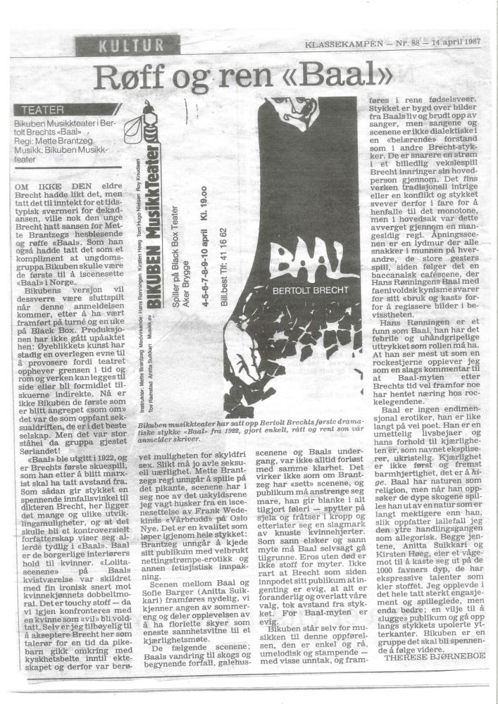 Røff og ren "Baal". Anmeldelse av Sampo Teater og Bikuben Musikkteaters produksjon Baal (1987). Anmeldelsen ble publisert i Klassekampen 14. april 1987.