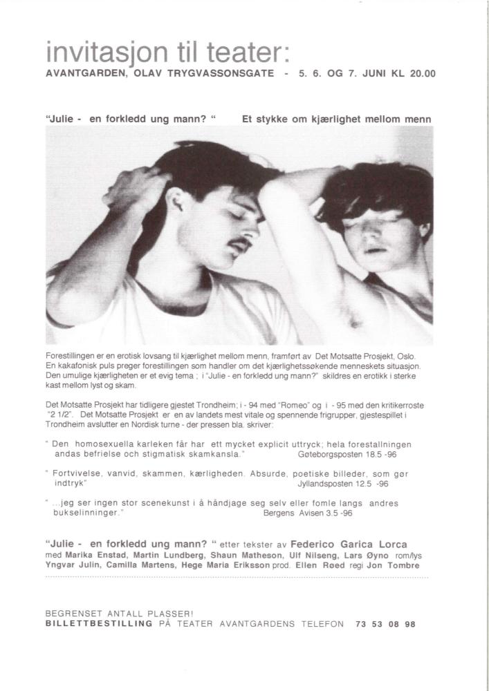Invitasjon til produksjonen Julie - en forkledd ung mann (1996) av Det Motsatte Prosjekt.
