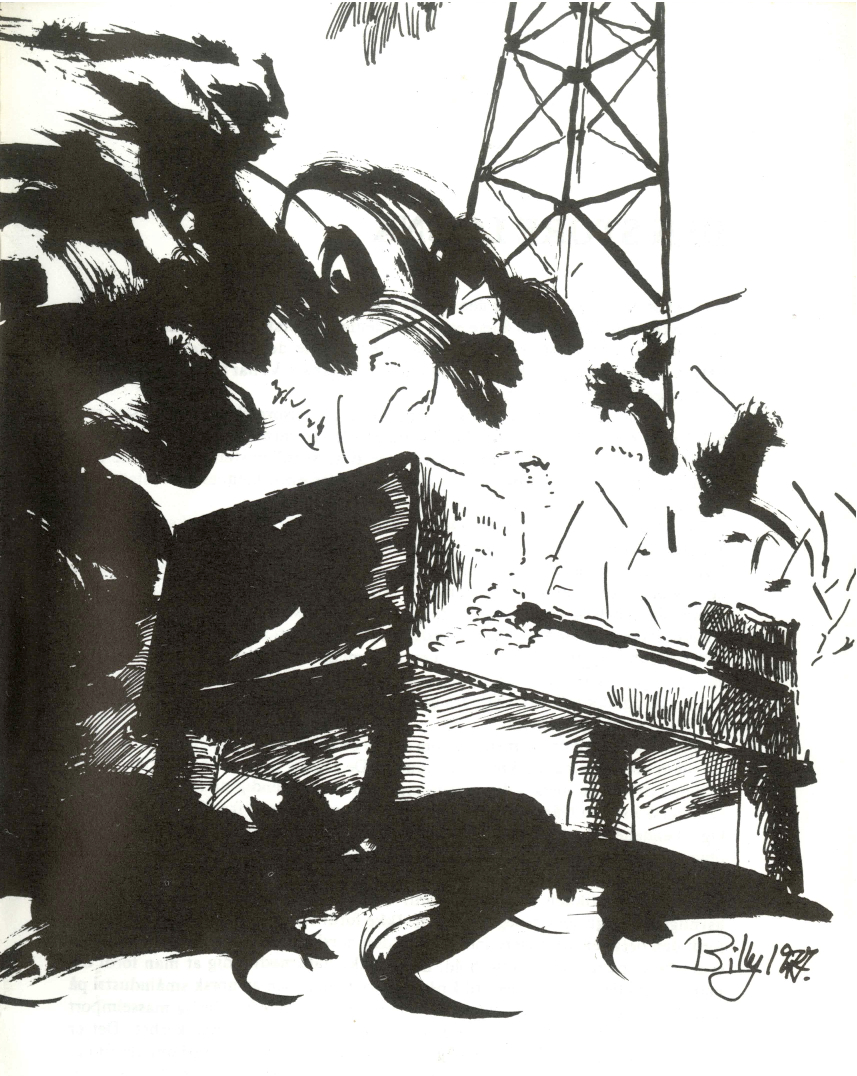 Tegning fra programmet til Tramteatrets produksjon Deep Sea Thriller (1977). Tegnet av Billy Johansson.
